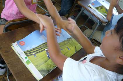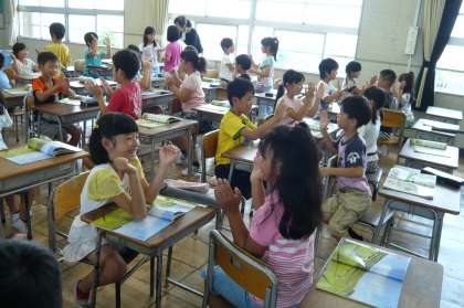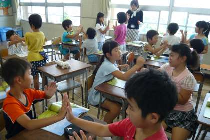 音楽で「茶つみ」を歌いました。それから、二人組になって、手拍子をとりました。二人のタイミングを合わせて楽しく行いました。