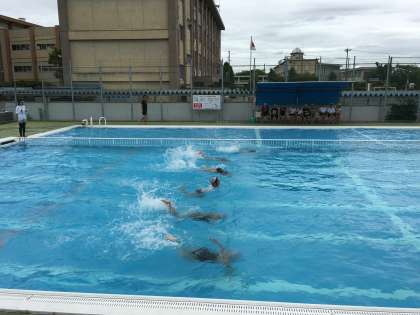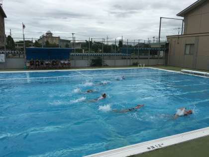プールでは6年生の応援の声が飛び交っています。今日はクラス対抗の水泳競技大会を開催しました。水中走、ブロック拾い、蹴伸び、クロールと平泳ぎの自由型、100メートルリレーです。それぞれの種目に出場した選手たちが、自分の力を発揮して泳ぐことができました。