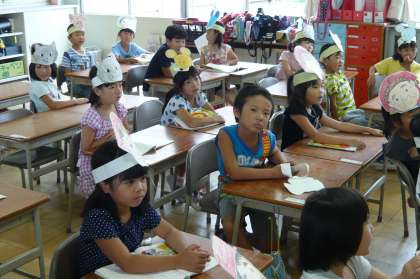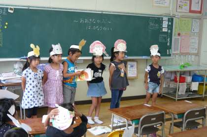 国語で学習した「おおきなかぶ」の音読劇を行いました。手作りのお面を付け、なかなか抜けないかぶをみんなで協力して抜く様子を劇と音読で表現しました。