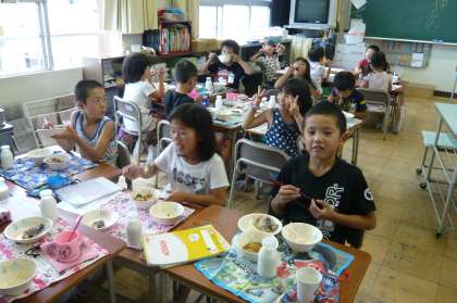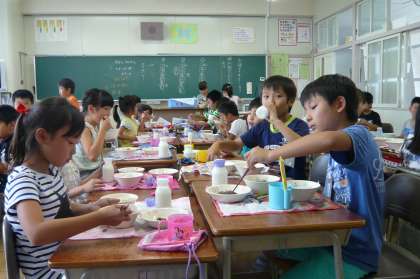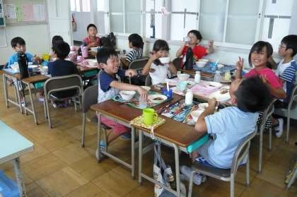 給食の時間は、笑顔がいっぱいです。毎日おいしい給食が出ます。楽しい放送を聞きながら、友達といろいろなことをお話ししながら食べています。