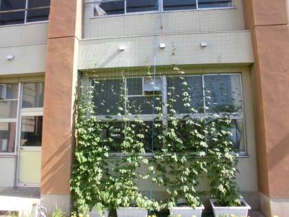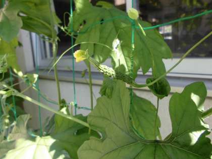 5月にゴーヤの種をまきました。今ではこんなに大きく成長し、たくさんの花が咲きました。花の先には、小さなゴーヤができはじめました。