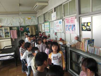 今日は、保健室、職員室、欠席黒板の場所を確認しました。保健室や職員室に入るときは、「失礼します。」と元気な声で入ることや、勝手に入ったり触ったりしてはいけないことを確認しました。