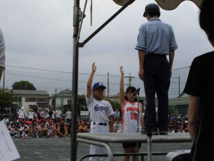 今日は、運動場と屋内運動場を会場に、向山連区子ども会のソフト・ドッジボール大会が行われています。午後から夏らしい日差しの戻った運動場では、そろいのユニフォームを着た子どもたちの元気いっぱいのプレーと、保護者の皆さんの応援の声で、熱気に満ち溢れています。