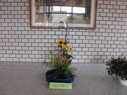 夏休みに入り、向山小学校の子どもたちは家庭でゆっくり過ごしていることでしょう。今日の花は、子どもたちの元気で、すてきな笑顔を思い浮かべながら今日の花を活けました。