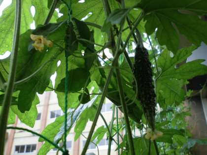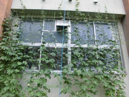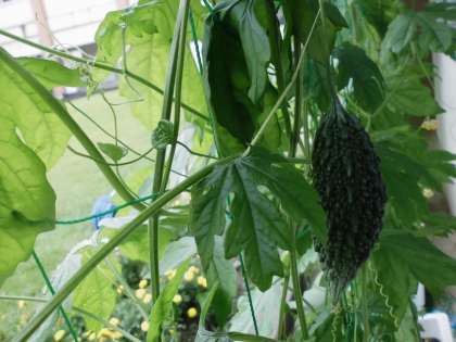 緑のカーテンとして植えているツルレイシにきれいな花とともに、ゴーヤの実がなりました。まだまだ小さい実ですが、これからどんどん大きくなって子どもたちに大きくなった姿を見せてほしいです。