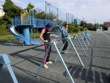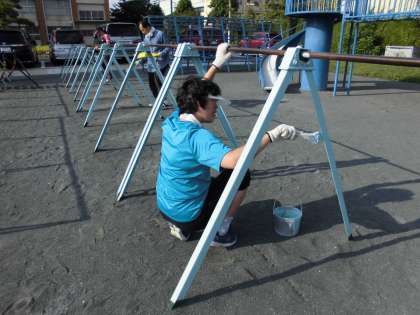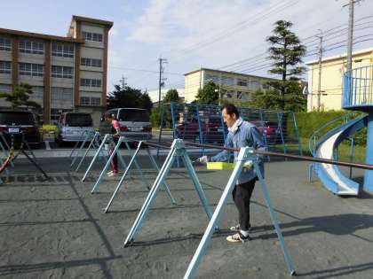 緑色だった鉄棒が、鮮やかなパステルグリーンになりました。本校の職員でペンキ塗りを行いました。