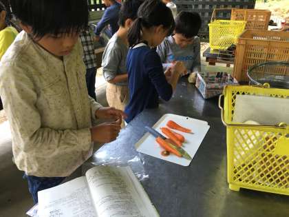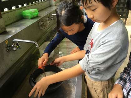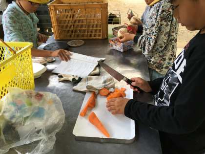 班で協力してカレーづくりです。いい手つきで野菜を切り始めました。お米も上手に洗っています。