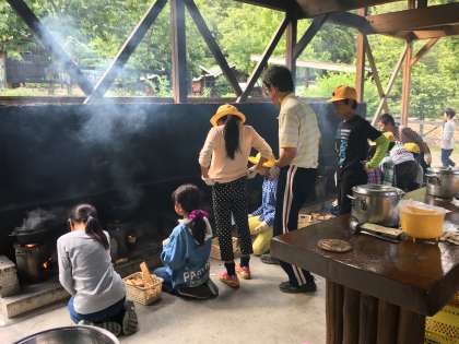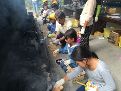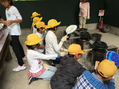 かまどに火をつけてご飯を炊き始めています。「美味しくな〜れ」とみんなで唱えながら楽しく作っています。