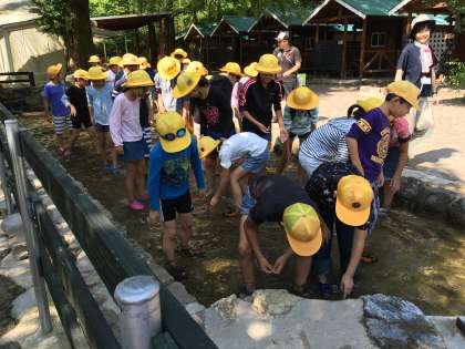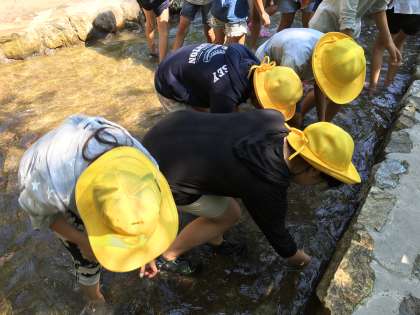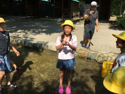 イワナつかみ体験の始まりです。魚に逃げられなかなか捕まえることができません。でも、1番早く捕まえた児童もいます。