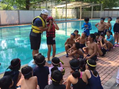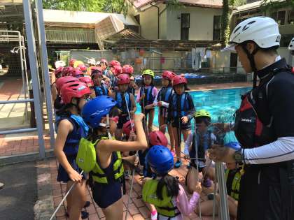 いよいよお楽しみの体験活動のはじまりです。川遊び班は、ライフジャケットとヘルメットを身につけました。