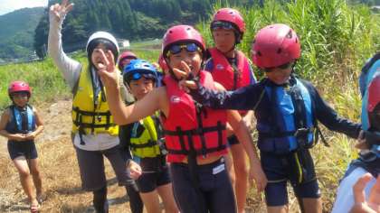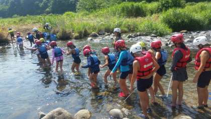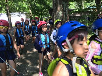 ライフジャケットに身を包み、いざ川遊び体験に出かけます。