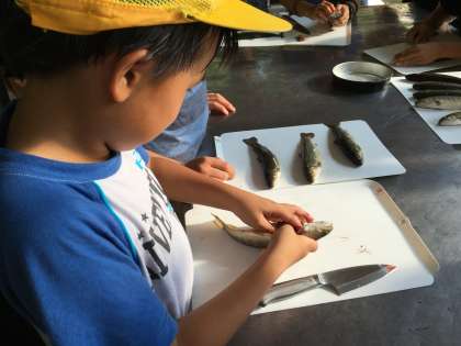 自分でつかんだイワナをさばいています。包丁を持つ手つきがいいですね。