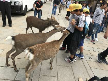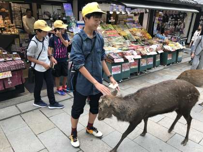 奈良公園では、多くの鹿と触れ合いました。奈良名物のお土産も買って楽しい時間を過ごしました。