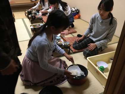 夕食です。みんなで協力してご飯をよそって、楽しく食事です。