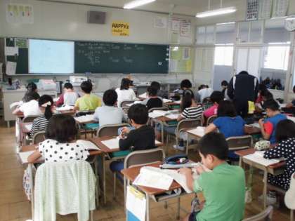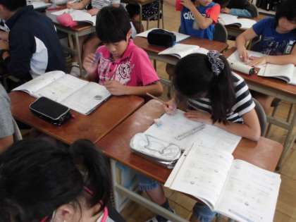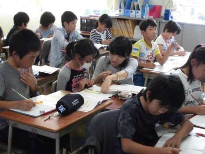 わり算の答えが2けたや3けたになる筆算の仕方について学習しました。計算が正しくできているかどうかを、先生がすぐに確認しています。