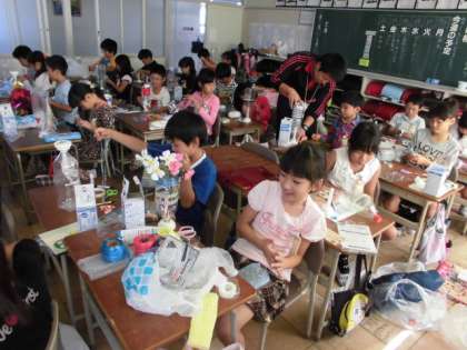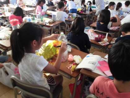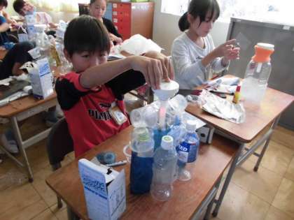 ペットボトルやセロハンなどの透明な材料を使って、光を通したらきれいな作品を作っています。自分のイメージに合わせて、組み合わせ方や飾り付けを工夫しています。