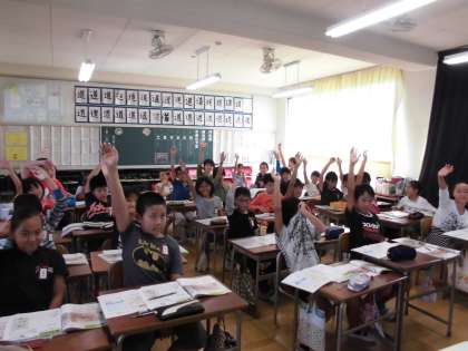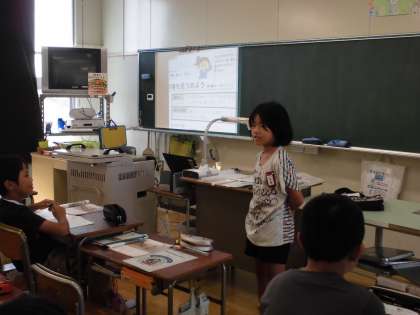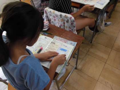 「身の回りの物や生活の場をみつめよう」をテーマに授業を行いました。普段の自分たちの部屋の中の状況を話題にして、散らかると困ることは何か、どう片づけたらいいのかというアイデアも出し合いました。机の中の道具箱を確認し、整理整頓もしてみました。ノートの付録につけられているシールを活用し、文房具の並べ方の工夫をしてみました。