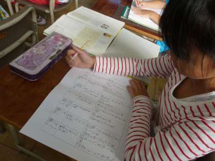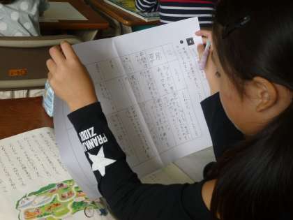 学校での一日の様子を思い出して、順番に整理して書きました。その中から、いちばん書きたいところを選んで、原稿用紙に書きます。どの部分を選んで、さらに、詳しく書くか考えます。