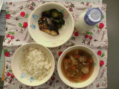 団子鍋 さばの塩焼き きゅうりの昆布和え 発芽玄米ご飯 牛乳