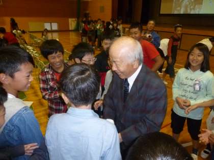 小出先生にお持ちいただいた資料などを見せていただきました。子どもたちは、先生を囲んで、握手を求めたり、質問をしたりしていました。