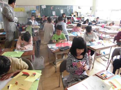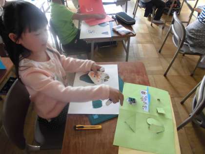 2年生の図工では、カッターナイフで紙にいろいろな切り込みを入れてできる窓を開く仕組みを使って、思い付いたものを表すという学習を進めています。子どもたちは、今までに教科書を参照しながら,カッターナイフの安全な使い方を学習し、家や窓の形,窓の開き方や窓の中に見えると楽しいものを考え、作品づくりに取り組みました。窓を開けると、お気に入りのがもの見えて、子どもたちも満足そうな表情でした。