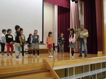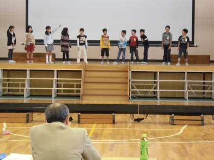 学芸会の練習では、「劇団うりんこ」の方に演技指導をしていただきました。せりふを言うときに動きを大きくするなど、大切なことをいくつも教えていただきました。さらに上手に演技できるよう、これからも一生懸命練習していきます。