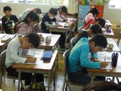 書写では、「文字の大きさに気をつけて書こう」というめあてで、原稿用紙に書く練習をしました。特に、漢字は、ますいっぱいに、ひらがなやカタカナは、漢字より少し小さめに書くことが大切であることを説明しました。
