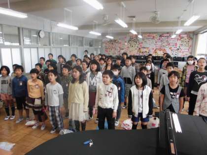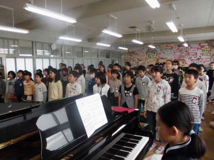 音楽室からいい歌声が聴こえてきました。5年生の歌の練習です。児童たちの目や口の開け方そして表情がとてもいいです。今日は、歌う姿勢に気をつけて、ほっぺたを柔らかくして、上半身の力を抜いて、歌う前にいっぱい息をすうことを学習しました。2重唱もお互いの声を聴きながら、歌うことができました。