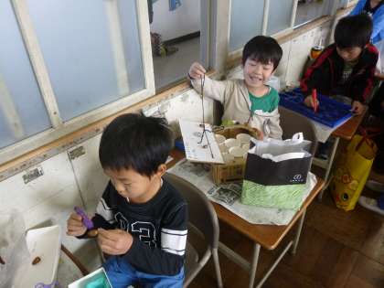 どんぐりや松ぼっくりなど、秋に見つけたものを使っておもちゃを作りました。楽器やおもちゃ、ゲームなど、子どもたちのアイデアがいっぱいの秋のおもちゃ作りでした。