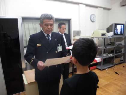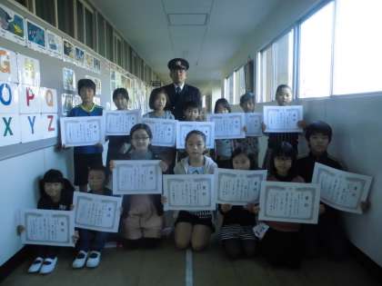 テレビ朝礼による、表彰伝達を行いました。防火に関する作品「習字の部の消防長賞・協会長賞・奨励賞」「ポスターの部の奨励賞」です。一宮消防署から星野様に来校していただき、表彰伝達を行いました。また、星野様からは、火事はみなさんの大切な物や家族を失う大変恐ろしいものです。家庭用火災報知器を各家庭で取り付けて防火意識を高めてください。というお話をいただきました。