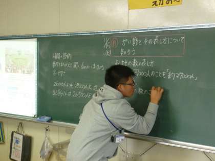 「がい数の表し方」について学習しました。まず、「がい数」とは何か、そして、どのようなとき、「がい数」で表すのかについて説明しました。生活の中に生きて働く大切な学習となります。