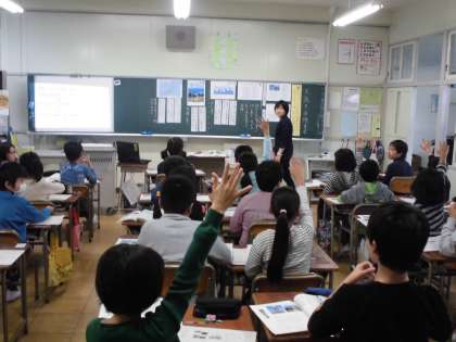 本日の5時間目、5年3組で国語の研究授業を行いました。説明文の学習で、「グラフや写真などの資料を使う意義」についてみんなで考えました。積極的に自分の考えを書いたり、ペアやグループで話し合ったりするなど、一生懸命学習に取り組んでいました。