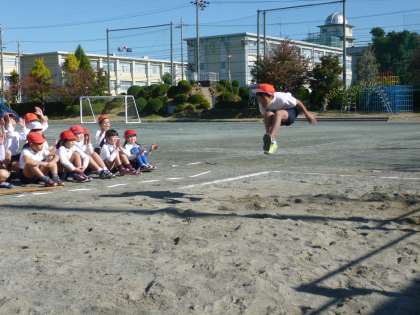 走り幅跳びをしました。勢いよく走りだし、踏み切りで強く蹴ることを指導しました。代表の児童の跳び方を見せ、イメージさせました。