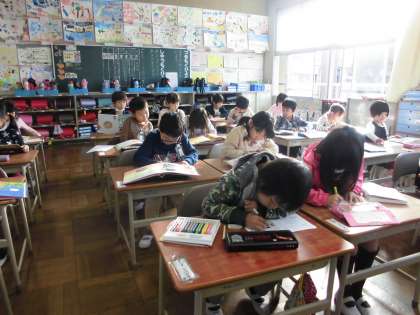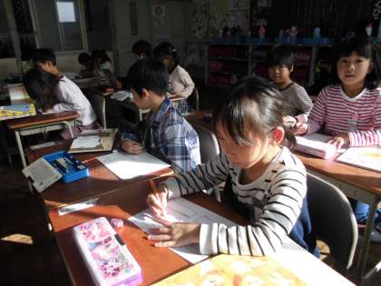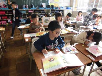 1年生の読書郵便の様子です。自分の気に入った絵本を選び、気に入った場面絵をはがきに模写しました。一人で何枚も絵ハガキを書くことができました。