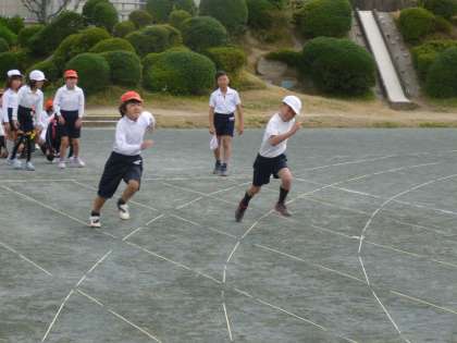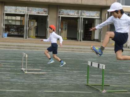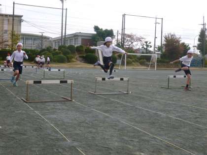 体育で「ハードル」の練習をしています。まず、初めに、50メートル走のタイムを測定し、その結果に基づいて、ハードル間の長さを選択しました。歩数や跳び方などに気を付けて跳びました。