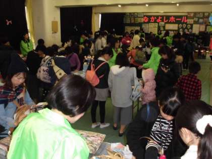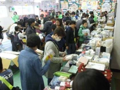 PTAバザーの物品販売のコーナーでは、各ご家庭から提供していただいたいろいろな品物を安く販売しています。開店と同時に、多くの人でにぎわっています。