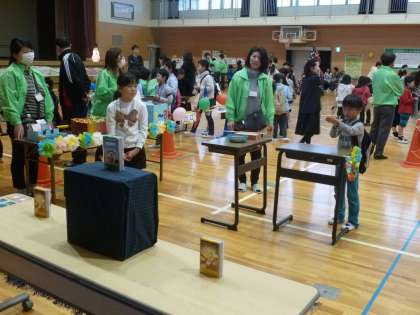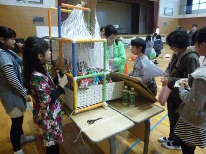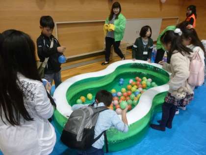屋内運動場では、ゲームコーナーが開かれています。千本引きや風船すくい、的あてなど、子どもたちが大好きなゲームがずらり並んでいます。子どもたちは喜んでゲームをしています。