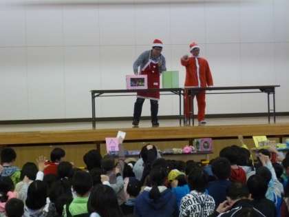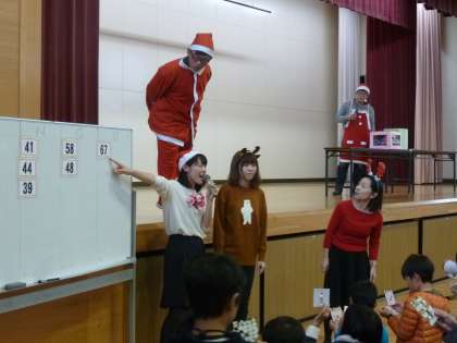 本校職員の進行による恒例の「スーパービンゴ大会」がバザーの締めくくりとして盛大に行われました。クリスマスバージョンの衣装に身を包んだ職員が、子どもたちと一体となってビンゴを盛り上げました。