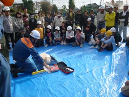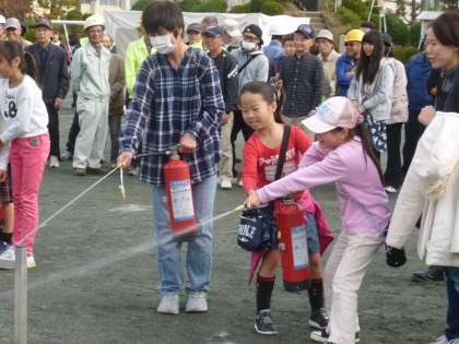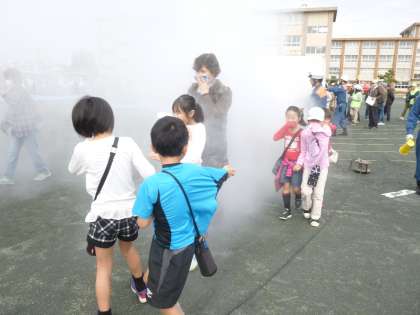 向山連区防災訓練が行われました。消防署や消防団の方から様々な訓練を指導していただきました。子どもたちも参加し、地域の方と一緒に「消火器の使い方」「簡易担架のつくり方」「AEDの使い方」などを体験しました。また、煙道体験では、煙で前が見えない中での避難の難しさを体験しました。