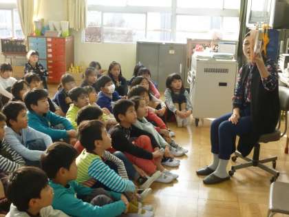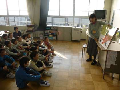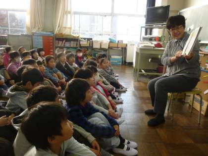 「もみじ読書週間」期間中は、様々な取り組みを進めています。今日は、PTA保護者読み聞かせボランティア「りぼん」の皆様による読み聞かせ会です。