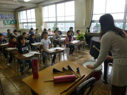 「サンバの演奏を楽しもう」というところを学習しています。今日は、サンバを聞きながら、アゴゴや小太鼓、ウッドブロックにシェーカーなどをたたいてみました。今の子どもたちは、リズム感がよく、聞きながらすぐにリズムに乗って楽器をたたくことができました。
