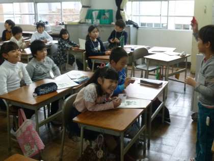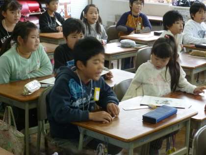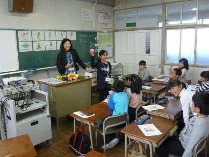 「What`s this ?」に対して「This is 〜」で答える学習を行いました。箱の中から取り出した果物を「これは何ですか」と、英語で聞きました。そして。「「This is 〜」で答えさせました。