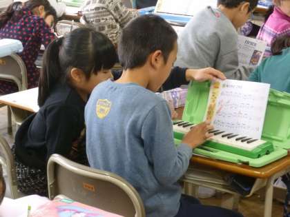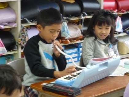 鍵盤ハーモニカで「ゆうやけ こやけ」のテストを行いました。ひいたあとには、拍手があったり、隣の子が楽譜を持ってあげたりしている様子が微笑ましく思いました。