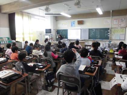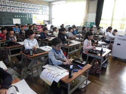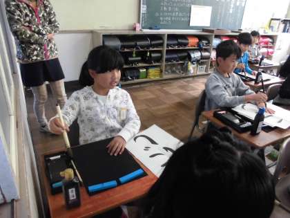 「ひらがなの筆使いに気をつけてかこう」というめあてで「にじ」という字を学習しました。デジタル教科書で映し出された画像の筆の動きに合わせて、下敷きの上に筆を運びながら練習する子や空中に筆を運ぶ子がいました。落ち着いて学習することができました。