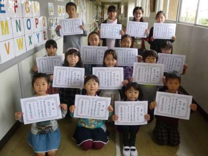 尾張教育研究会書写コンクールで、賞をいただいた児童を表彰しました。特選と入選の代表児童には、一人一人に賞状を手渡し、その様子をテレビ放送で見てもらいました。