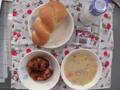 さつまいものポタージュ 鶏肉のバーベキューソース パン ミルメーク 牛乳