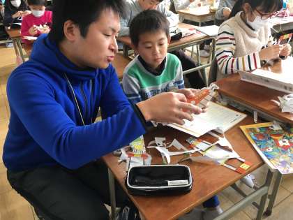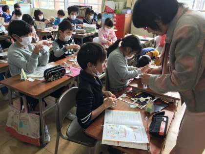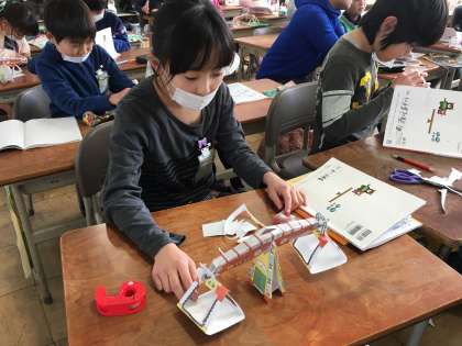 物の重さを比較する授業を進めています。教科書の巻末資料についている天秤を作成しました。