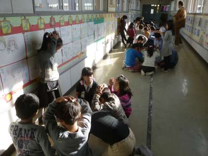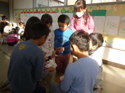 「友達と仲良くする」「掃除を一生懸命する」「廊下を走らない」など、道徳や生活に関する内容でカルタをつくりました。今日は、グループごとで、この手作りカルタを使って遊びました。