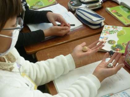 「同じ体積でも、ものの種類が違うと重さばどうだろうか。」ということについて調べました。実際に同じ体積の「木」「ガラス」「鉄」の玉を持ってみて比べてみました。明らかな違いを感じることができました。