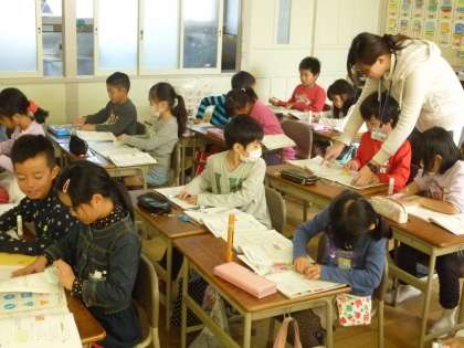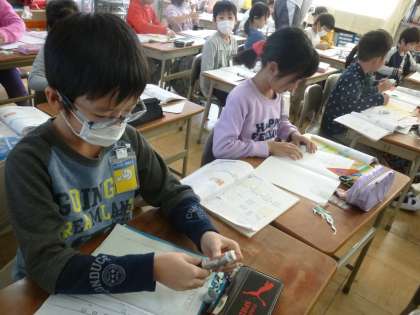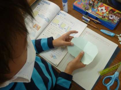 紙を折って、本やノートの角のかたちを作らせました。そして、できた角の部分を「直角」と呼ぶことも説明しました。